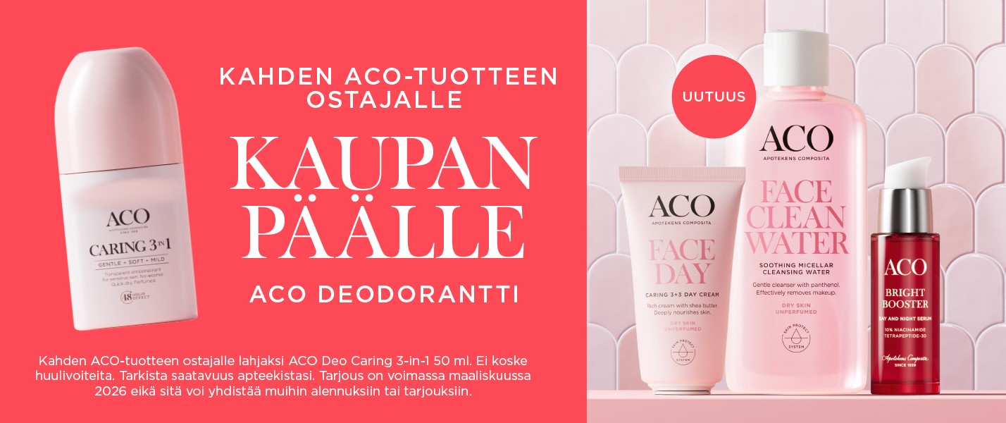 Maaliskuussa kahden ACO-tuotteen ostajalle ACO Deo Caring 3-in-1 (50 ml) kaupan päälle! Tarjous ei koske huulivoiteita eikä sitä voi yhdistää muihin tarjouksiin tai alennuksiin. Kaupanpäällisiä rajoitettu erä.