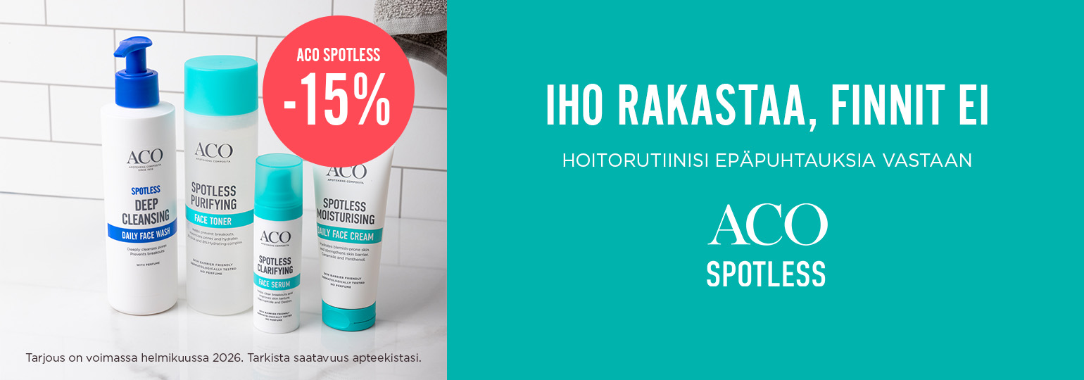 Helmikuussa ACOn epäpuhtaan ihon Spotless-tuotteet -15% tarjouksella. Tervetuloa tutustumaan! Löydät tuotteet myös verkkokaupastamme.