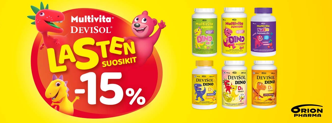 Orionin lasten suosikkivitamiinit tammikuussa -15% tarjouksella! Multivita- ja DeviSol-tuotesarjojen lasten vitamiinit hurmaavat hauskalla ulkomuodollaan ja herkullisella maullaan. Pureskeltavat nallen ja dinon muotoiset vitamiini- ja kalsiumvalmisteet maistuvat pikkuväelle ja auttavat täydentämään päivittäistä ravitsemusta.